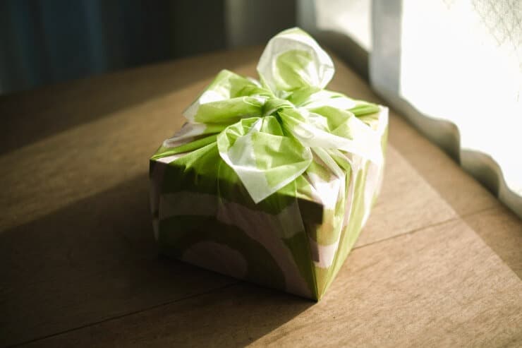 薄緑色の風呂敷に包まれた朱色の2段重箱。