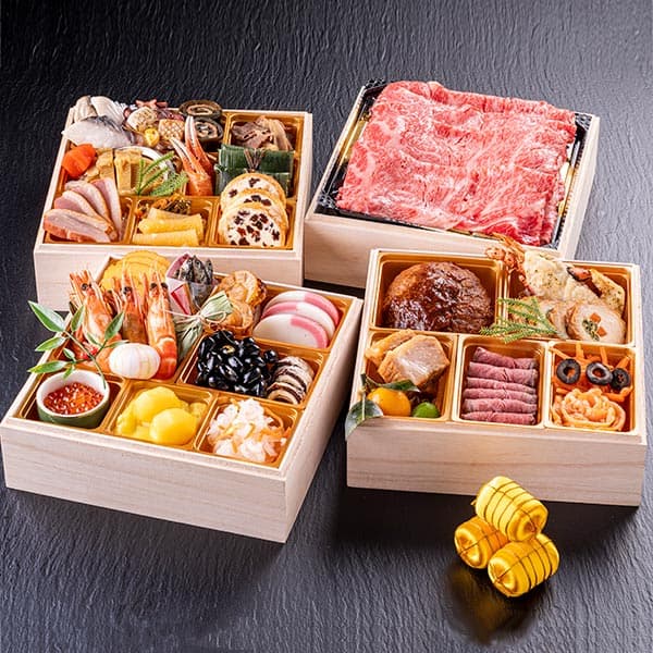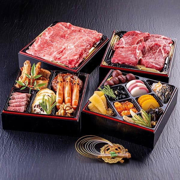 和の伝統的なおせち2段に、テンダーロインステーキ肉(ヒレ肉)としゃぶしゃぶ肉の豪華2段を組み合わせた贅沢なおせちです。