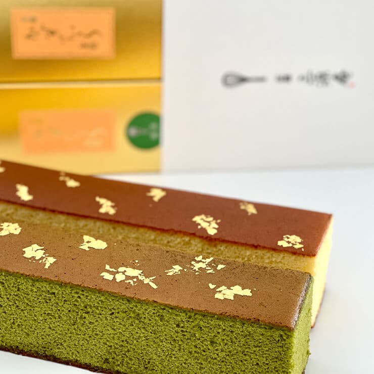 三重県産小麦粉に新鮮な国産鶏卵を使用し、カステラの上にのせられた金箔が、一気に高級感を演出してくれます。プレーンと抹茶を各1本ずつセットにいたしました。
