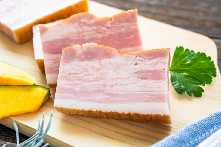 3つ目はベーコンです。ベーコンは豚肉を塩漬けにした後、塩を抜き燻製にしたものを指します。
