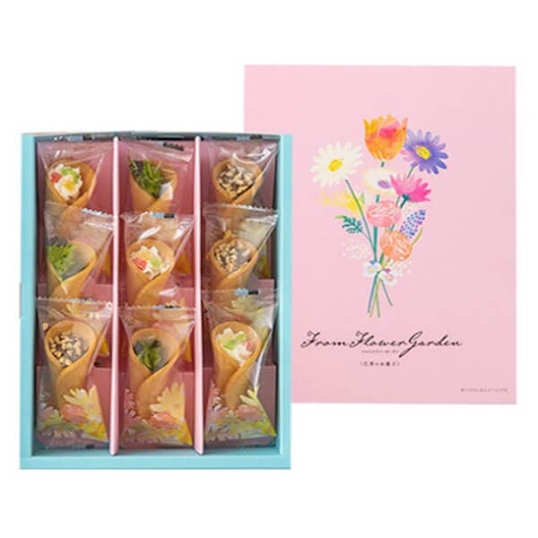 「京せんべい」を円錐状に成形してクリームを入れ、花束をイメージして可愛らしく仕上げたお菓子。