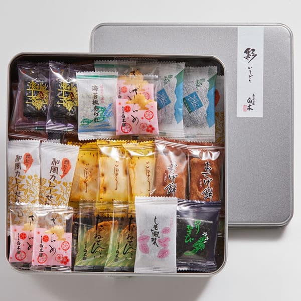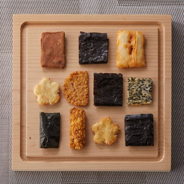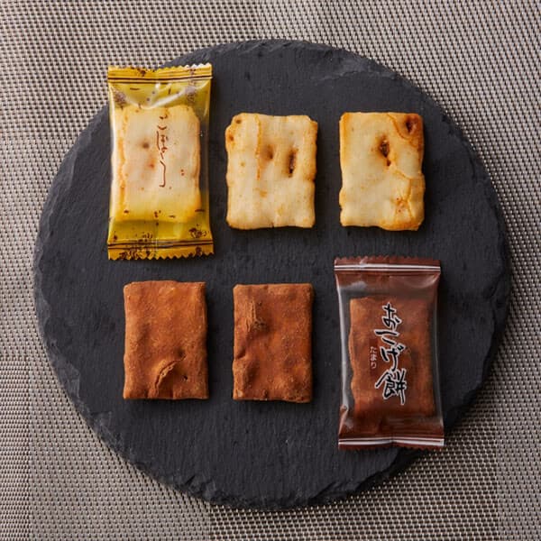 売れ筋No.1のごぼうあられから、和風カレーせんべい、海苔巻、ザラメなどさまざまなあられを詰め合わせました。