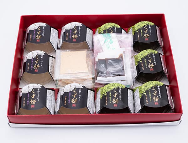 創業より50余年間、昔ながらの寒晒し製法を守り作ってきた自家製の上質な吉野本葛を使用し、独自の製法で作り上げた半生タイプのくず餅です。​​自家製の上質な吉野本葛特有の粘りと舌ざわり、喉越しのよさを楽しめます。