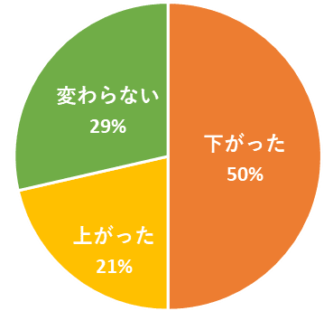 結果は、「下がった」が50%、「変わらない」が29%、「上がった」が21%となりました。こちらも緊急事態宣言が長引いていることが影響しているのか、客数が減少したと答えた方が半数を占めました。一方で、半数は客数を維持できているようです。