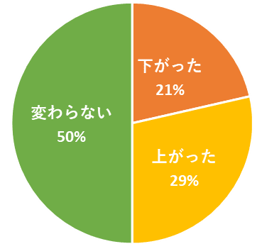 結果は、「変わらない」が50%、「上がった」が29%、「下がった」が21%なりました。客単価は変わらず経営が続いている飲食店が半数を占めました。