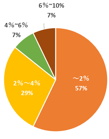 結果は、「~2%」が57%、「2~4%」が29%、「4~6%」が7%、「6~8%」が7%となりました。 一般的には5%程度、最低でも3%程度を広告宣伝費に充てるのがベストだと言われていますが、販促費にあまり費用を充てられていないのが現状のようです。