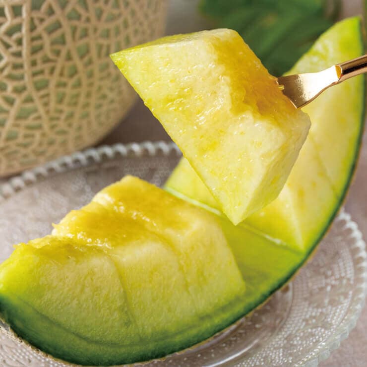 従来のアールスメロン(いわゆるマスクメロン)よりも、まろやかで気品に満ちた甘みが色濃く結晶しているのが、メロンのプリンセスと言われる所以です。