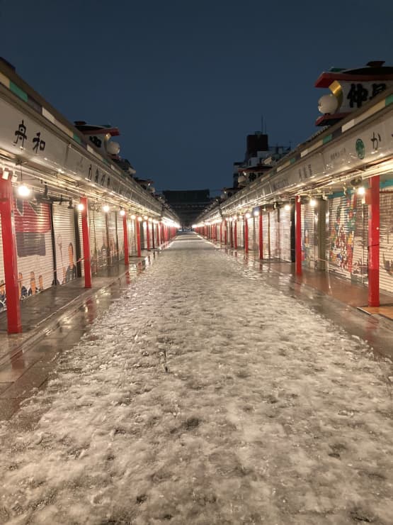 画像は今朝通ってきた浅草仲見世です。マットを敷いて店内に入るまえにしっかり雪と泥落しをしましょう。