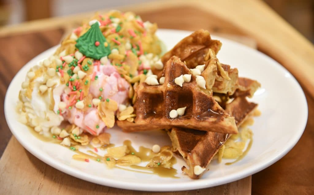 冷凍ワッフルを焼いて、メープルシロップや生クリームなどを添えて提供することができます。