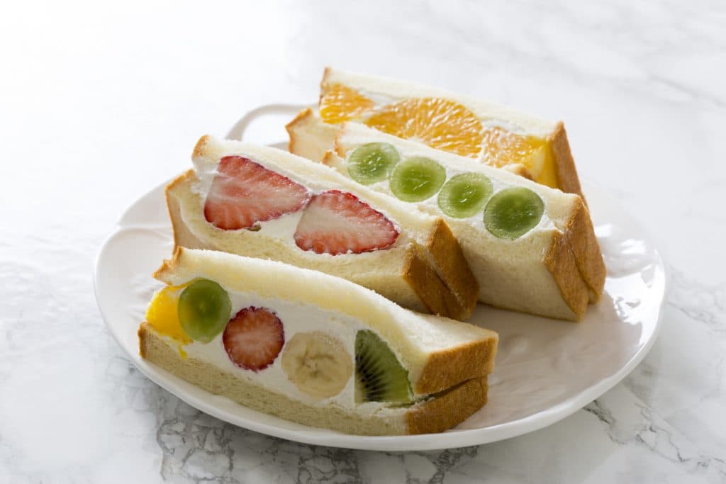 毎朝お店で焼き上げるサンドイッチに使用する食パンは、国産小麦の湯ごね生地を使うことで、しっとりとした食感にし、フルーツサンドに合わせ、甘さは控えめに仕上げています。店内ではお好みのサンドイッチを二切れずつ「ハーフ&ハーフ」でお選びいただけます。「フルーツミックスサンド」と「名物 かにサラダサンド」など、ご自由に組み合わせてお楽しみください。