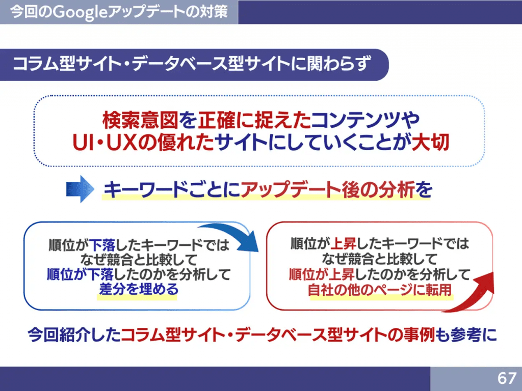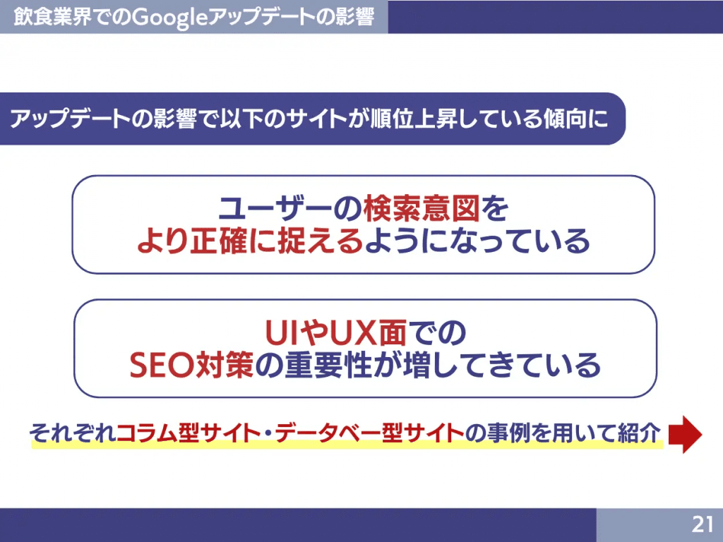 アップデートにより、「ユーザーの検索意図の正確な捉え方」と「UI・UX面でのSEO対策の重要性」が増加していることについて、事例をもとに詳細に確認できます。