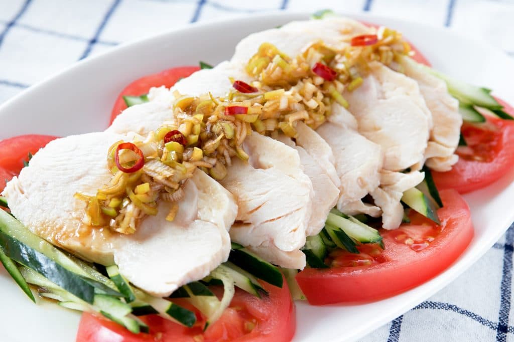 (3)容器に☆、蒸し汁を入れて砂糖が溶けるまで混ぜ、ねぎ、にんにく、鶏肉、千切りにした皮を加えてなじむように混ぜる。
