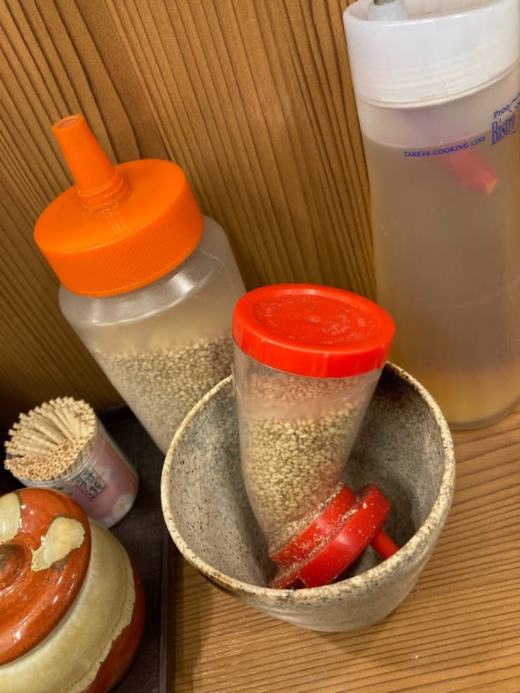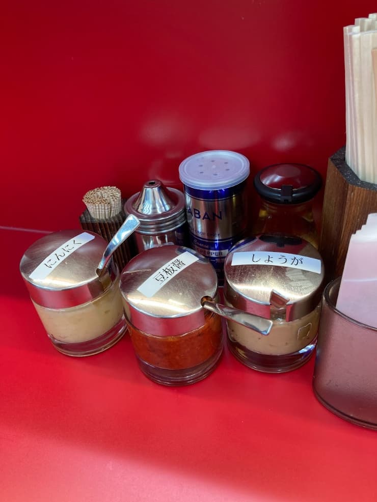 ではカウンターの上の装備を見ていきましょう。にんにく、豆板醤、ショウガ、ごま、コショウ、酢と標準装備品が揃っているようですね。