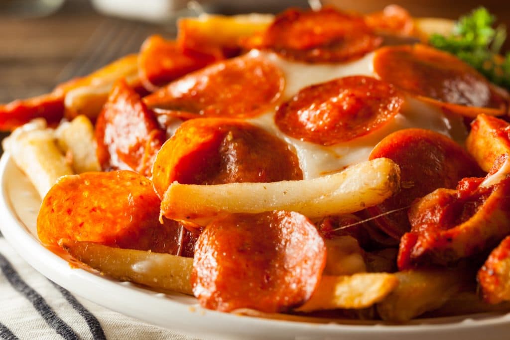 フライドポテトの上にピザソース、チーズ、好きな具材を乗せてオーブンで焼きます。