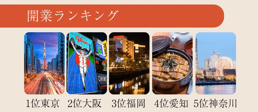 また、閉店数のトップも東京(1,808件)と大阪(916件)、続いて神奈川、埼玉、兵庫といった主要都市が上位に並んでいます。開業が多い=競争が激しい地域でもあり、事業環境の厳しさが反映されていると考えられます。