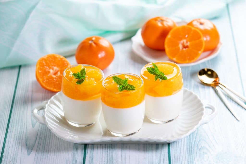 作り方:生クリームと牛乳で作ったパンナコッタ液に、みかんの果汁を加えて冷やし固める。