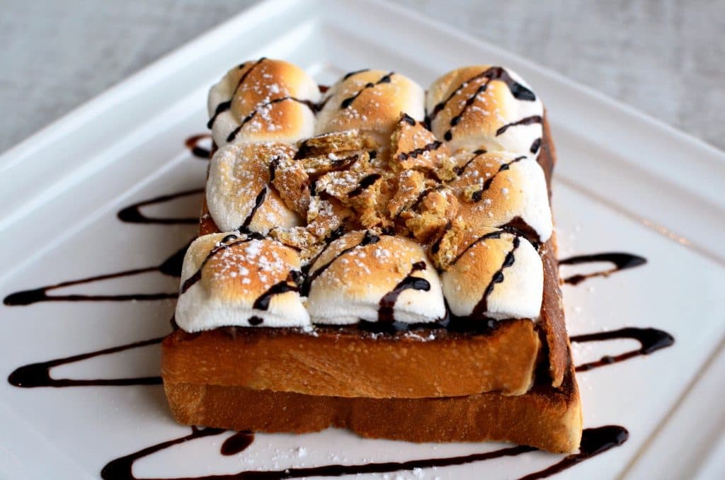 マシュマロを竹串に刺して焼き、外はカリッと中はとろける食感を味わえるデザート。
