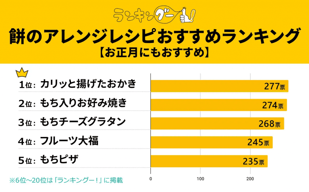 ランキングー!では餅のアレンジレシピおすすめランキングを調査。10~50代の男女(性別回答しないを含む)5,008名にアンケートを行い、TOP20を決定しました。ここではTOP5をご紹介します。