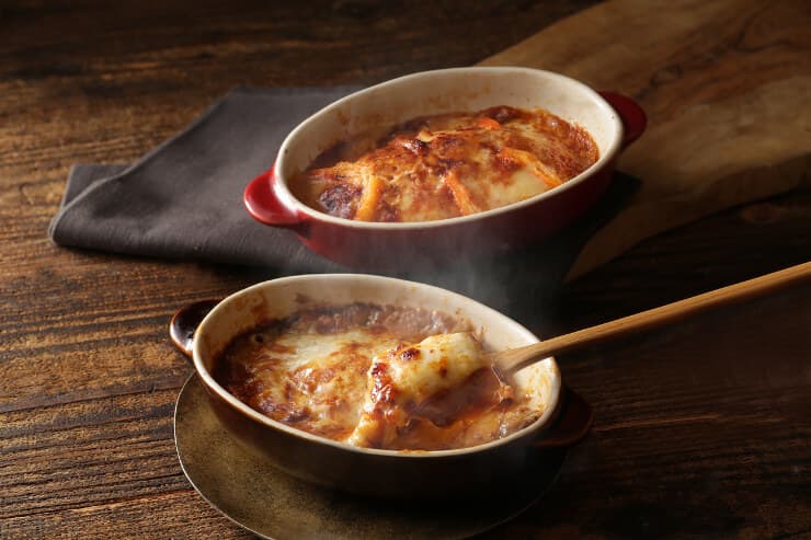 作り方: グラタン皿にミートソースと餅を入れ、チーズをたっぷりかけてオーブンで焼き上げます。