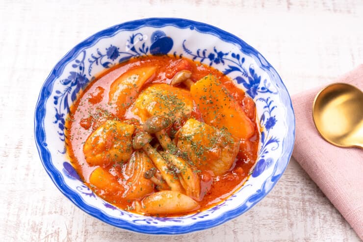 作り方:鍋にトマト缶、餅、野菜を入れて煮込みます。バジルを散らして完成です。