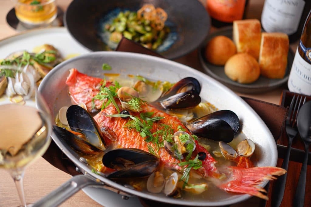 その日一番の鮮魚をブイヤベースやアクアパッツァに、また旬の野菜をシンプルにグリルする、時間をかけてじっくり炊き上げる、など素材に応じて調理法を変えて提供します。
