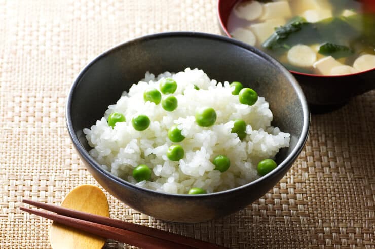 - グリーンピースは炊飯器の上に均等に広げるようにして加える。