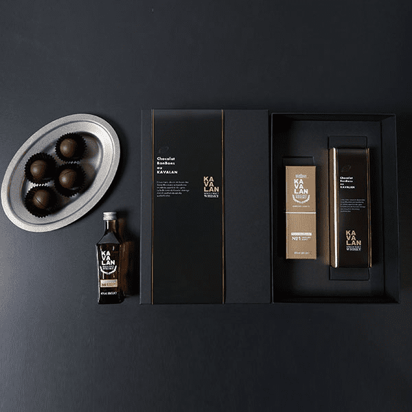 フランスで1922年に創業した老舗チョコレートメーカー、ヴァローナ社のショコラを使用したボンボン『Chocolat Bonbons au KAVALAN(ショコラ・ボンボン・オ・カバラン)』と、ウイスキー界の常識を覆した驚異のプレミアムシングルモルトウイスキー『カバラン』のセットです。