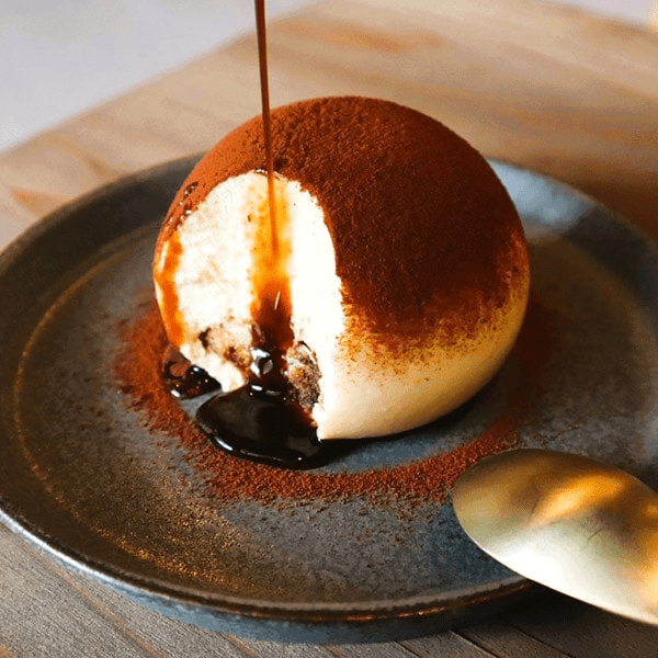 ココア&抹茶パウダーをかけティラミスソースを注ぐと