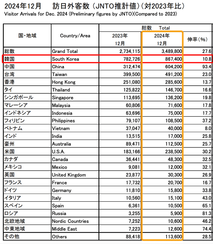 コロナ禍以降、海外渡航制限の緩和により訪日外国人観光客数は再び増加傾向にあります。なかでも、2024年12月時点の訪日外客数では韓国が約86万人と最も多く、ショッピングやグルメ、観光地巡りなどを目的とした高い消費意欲が見込まれる市場として注目を集めています。日本への直行便が多いことも、安定的な訪日需要の後押し要因です。