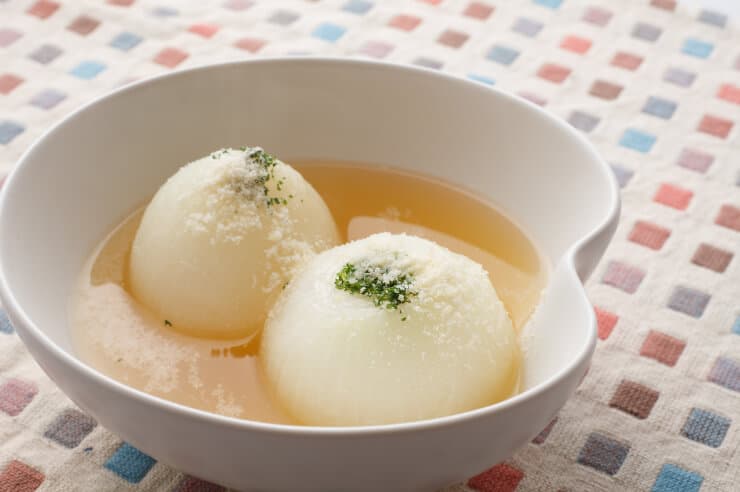 • 新玉ねぎの皮をむき、上下のヘタを少し切り落とす。