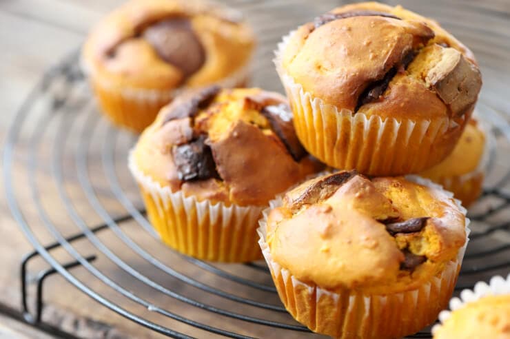 3.カップに生地を等分に入れ、残りのチョコレート(50g)を割りながら等分にのせる。180℃に予熱したオーブンで12〜15分焼く。