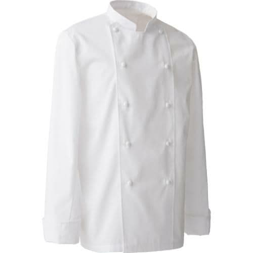 白を基調としたコックコートは、清潔感を演出し、プロフェッショナルな印象を与えます。