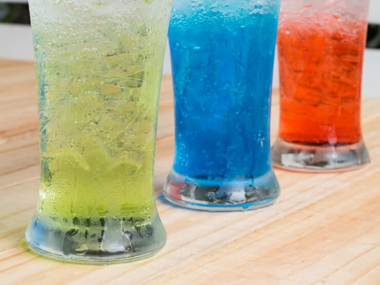 パステルカラーシロップ:イチゴシロップ(ピンク)、ブルーキュラソーシロップ(青)、メロンシロップ(緑)、バイオレットシロップ(紫)
