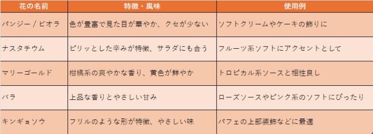エディブルフラワーは、単に「飾り」としてだけではなく、ソフトクリーム全体の印象や体験価値を引き上げる重要な要素となります。