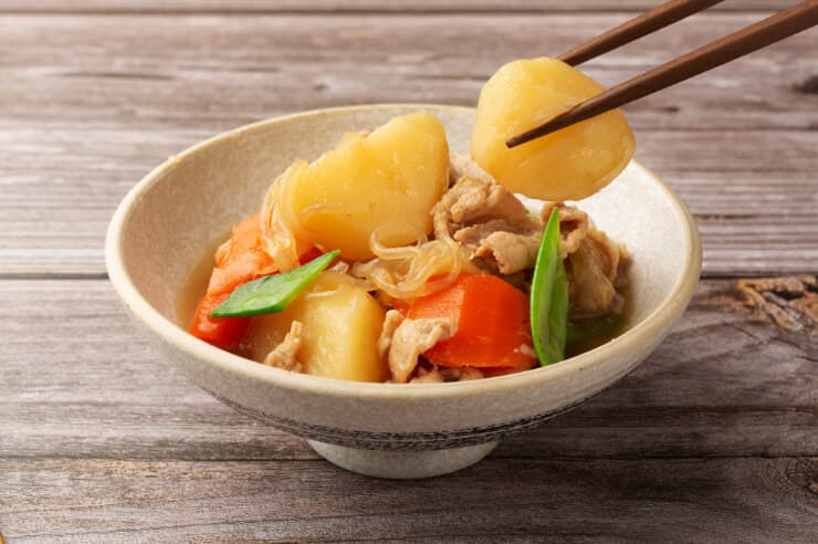 じゃがいも、玉ねぎ、牛肉で作る肉じゃがは、日本の家庭料理の代表格です。甘辛い味付けが「ほっ」とする味で、ご飯にも合います。