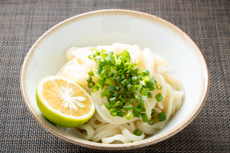 冷たいうどんに、かぼすの薄切りを浮かべた爽やかな一品です。見た目も美しく、暑い季節にぴったりの料理です。