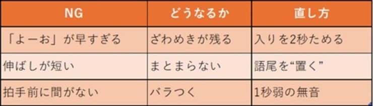音頭や合図が長いと効果が濁り、短すぎると意味を受け取れません。