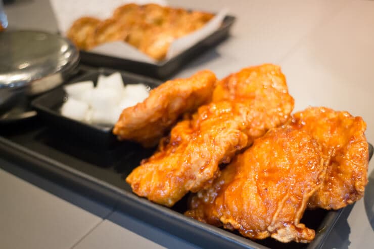 韓国フライドチキンは味のバリエーションが豊富です。定番のクリスピータイプのチキンは、「フライド」と呼ばれています。ハニーマスタードソースやスイートチリソースをかけて味の変化も楽しめます。