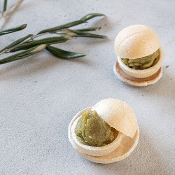 オリーブの葉を手摘み、粉砕したオリーブパウダーを餡にしました。
