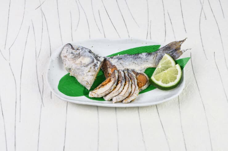 魚のウロコを落とし、エラと内臓を取り除きます。魚の内側と外側にしっかり塩をすり込み、ラップで包みましょう。