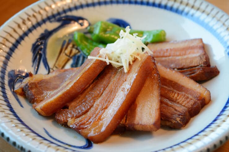 ラフテーは、豚の三枚肉を泡盛や黒糖、醤油でじっくり煮込んだ料理で、柔らかくとろけるような食感が特徴です。