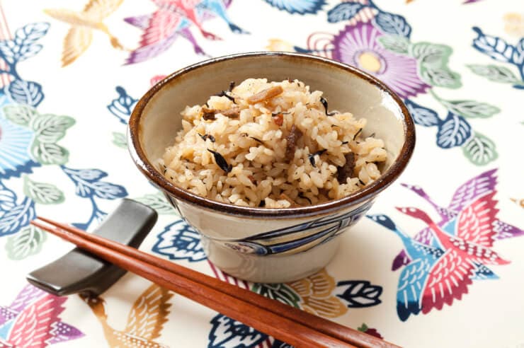 沖縄風炊き込みご飯で、豚肉や昆布、人参、しいたけなどを一緒に炊き上げます。味付きご飯として単品でもおいしく、おにぎりとしても人気です。