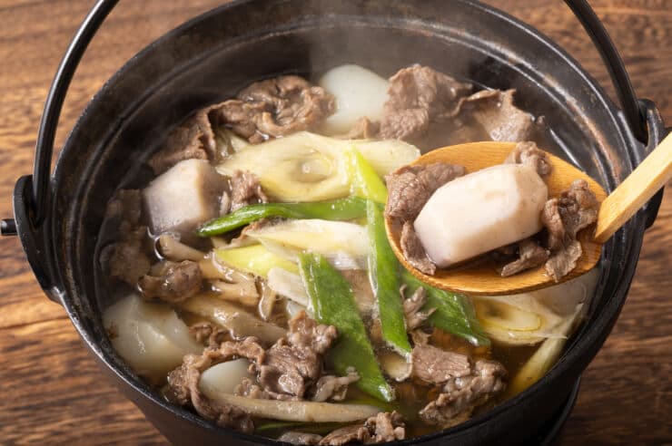 秋の風物詩として有名な山形のいも煮。里芋、牛肉、こんにゃく、ねぎを甘辛い醤油味で煮込んだ料理で、河原での「いも煮会」とともに親しまれています。