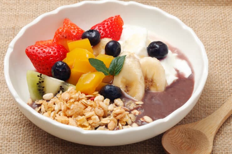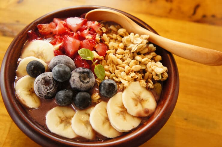 冷凍アサイーをミキサーでペースト状にし、バナナ・ベリー・グラノーラをトッピング