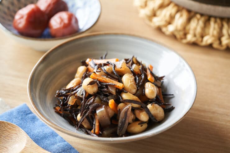 • ひじきの煮物:乾燥ひじきを水で戻し、にんじん・油揚げ・大豆と煮るだけ