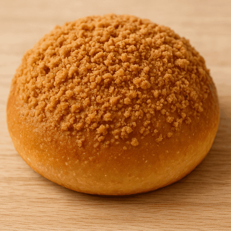 表面にクッキー生地のようなそぼろをのせて焼き上げたパン。サクサク食感とふわふわ生地のコントラストが特徴。