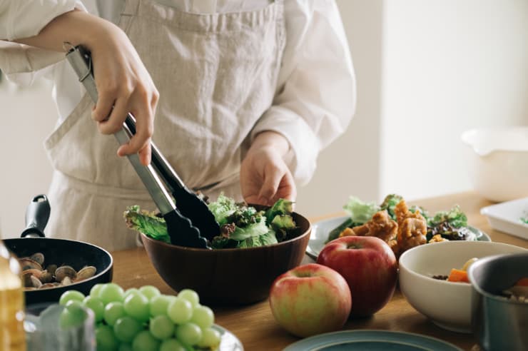 ベースには、レタスやケールなどのリーフ野菜を使い、そこにグリルチキンやサーモン、豆類やゆで卵をトッピングすると、食べ応えと栄養価がアップします。