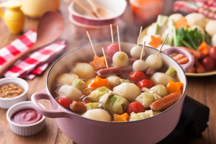 • 洋風出汁: コンソメ+白ワイン少々+塩で煮込む。トマトおでんやチーズもち巾着に◎。
