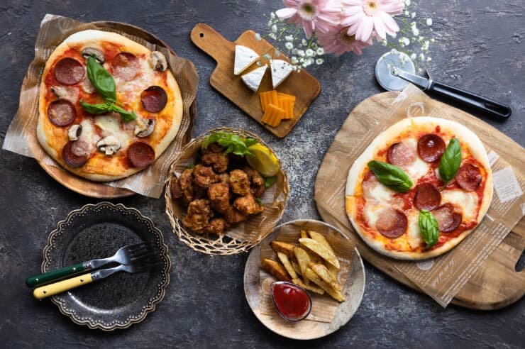 | 居酒屋 | 唐揚げ盛り合わせ、ポテト3種、ハーフピザ | 手づかみで楽しい・写真映え |