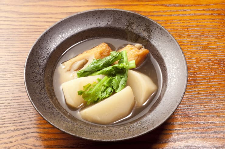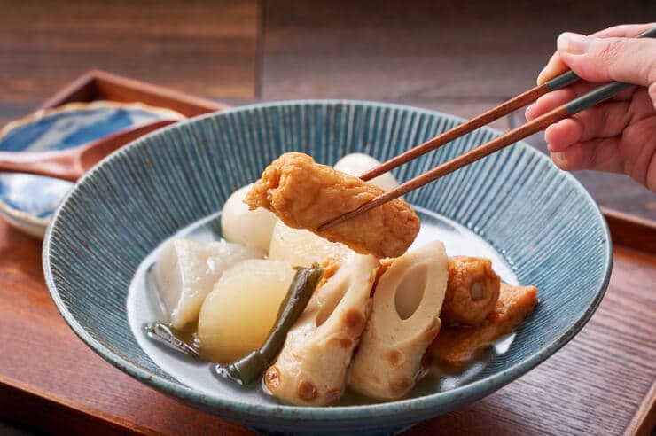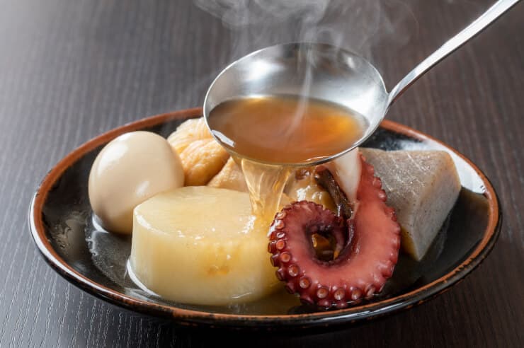 関西では「関東煮(かんとだき)」とも呼ばれ、昆布と鰹節の出汁を生かした薄味仕立てが特徴です。